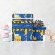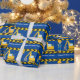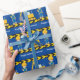Cooler Bausatz Geburtstagsparty Packpapier für ein Kind, das gelbe Baufahrzeuge in schwarz und gelb auf blauem Geschenkpapier Liebe. Fun Fahrzeug Design für einen kleinen Jungen, der Lieben von Autos und LKWs. Passen Sie mit dem Namen Ihres Kindes und dem GLÜCKLICHEN GEBURTSTAG in Weiß unter dem schwarz-gelben Kautionsband an.