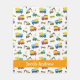 Eine niedliche und farbenfrohe Konstruktionswagen Thema Muster Decke! Das Muster besteht aus vielen Bauelementen wie einem roten und gelben Müllwagen, der den Schutt trägt, einem orangefarbenen Bagger, einem grünen Frontlader, der Schmutz schiebt, einem blau-gelben Betonmischer, orangefarbenen und weißen Zangen und einer gelb-schwarzen Sperrschicht. Personalisieren Sie den Namen des untergeordneten Elements in der bereitgestellten Textvorlage.