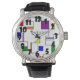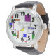 Diese Herren-Uhr hat ein Bauhaus-Design von Linien, die vertikal und horizontal verlaufen, um ein Raster mit Quadraten, Rechtecken, Dreiecken und Kreisen zu bilden, die um das Raster angeordnet sind. Wenn Ihnen das Design gefällt, aber andere Farben bevorzugen, dann schreiben Sie mir.