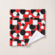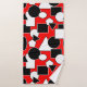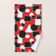Dieses Handtuchhandtuch-Set hat ein Bauhaus-Design aus Dreiecken, Kreisen, Rechtecken und Pentagonen in Schwarz und Weiß auf einem roten Feld.