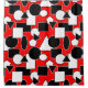 Dieser Duschvorhang hat ein Bauhaus-Design aus Dreiecken, Kreisen, Rechtecken und Pentagonen in Schwarz-Weiß auf einem roten Feld.