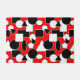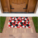 Diese Türmatte hat ein Bauhaus-Design aus Dreiecken, Kreisen, Rechtecken und Pentagonen in Schwarz-Weiß auf einem roten Feld.