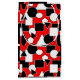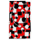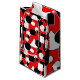 Diese Geschenktasche hat ein Bauhaus-Design aus Dreiecken, Kreisen, Rechtecken und Pentagonen in Schwarz-Weiß auf einem roten Feld.