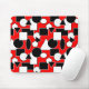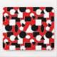Dieses Mauspad hat ein Bauhaus-Design aus Dreiecken, Kreisen, Rechtecken und Pentagonen in schwarz-weiß auf einem roten Feld.