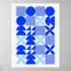 Minimalist Bauhaus-style poster featuring geometric blue circular patterns, advertising the 1923 exhibition held from July to September.