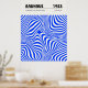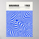 Minimalist Bauhaus-style poster featuring geometric blue circular patterns, advertising the 1923 exhibition held from July to September.