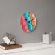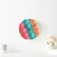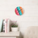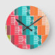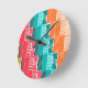 This clock has a Bauhaus-inspirred design of shapes and lines in different shades of mid-century modern colors.