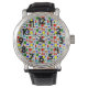 Diese Herren-Uhr hat ein Bauhaus-Design aus einem Gitter mit Quadraten und Rechtecken in rot, grün, blau, orange, hellblau, gelb und rot.