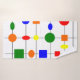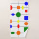 Dieses Set ist mit einem gelben Waschlappen, einem orangefarbenen Handtuch und einem Badetuch ausgestattet, das im Bauhaus-Design mit roten, gelben, orangefarbenen, grünen und blauen Formen gestaltet ist.