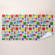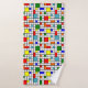 Dieser Duschvorhang ist mit einem hellblauen Waschlappen, einem blauen Handtuch und einem Badetuch mit einem Bauhaus-Design aus roten, grünen, blauen, orangefarbenen, hellblauen, gelben und roten Quadraten und Rechtecken ausgestattet.