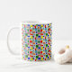 Diese Tasse hat ein Bauhaus-Design mit roten, grünen, blauen, orangefarbenen, hellblauen, gelben und roten Quadraten und Rechtecken.