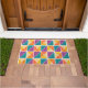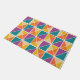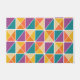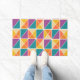 Diese Türmatte hat ein Bauhaus-Design von Quadraten aus Dreiecken in Orange-, Gelb-, lila- und Blautönen.