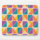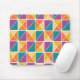 Dieses Mauspad hat ein Bauhaus-Design aus Dreiecken in Orange-, Gelb-, lila- und Blautönen.