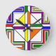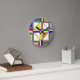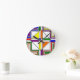 Die Wanduhr hat ein Bauhaus-Design aus Linien, Dreiecken, Diamanten und Quadraten, das ein Buntglas in Primär- und Sekundärfarben aussieht.