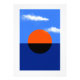 Ein gewagtes, abstraktes Bauhaus-inspiriertes Kunstwerk mit einem lebhaften, orangen und schwarzen Sonnenuntergang über tiefblauem Wasser, einem strahlend blauen Himmel und weichen weißen Wolken oberhalb