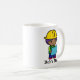 Junge mit lila Haar in einem gelben Hut mit Blueprints. Personalisieren Sie es mit Ihrem Namen. Für den Ingenieur, Auftragnehmer oder Architekt.