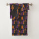 Kleiden Sie oben Ihr Badezimmer für Halloween mit diesen Tüchern, die ein Muster der immergrünen Bäume der von Hand gezeichneten Art in Halloween-Farben kennzeichnen: Orange, Lila und Holzkohlengrau gegen einen schwarzen Hintergrund ist für das Hinzufügen einer Touch Halloween-Beifalls Ihrem Tag perfekt.