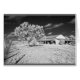 Schwarz-Weiß Infrarot Foto einer Scheune, Baum und Zaun auf einer Ranch von Texas im Süden.