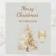 Ein sanfter, grün begrünter Hintergrund auf der Vorderseite, der mit einem von Hand gezeichnet, wasserfarbenen, schneebedeckten Kiefernbaum geschmückt ist. Text: Frohe Weihnachten. Personalisieren Sie Ihr Firmenlogo und Ihren Firmennamen und fügen Sie es hinzu.