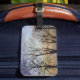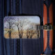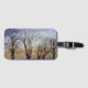 Ein Gemälde von silhouetted Bäumen gegen einen atmosphärischen Winterhimmel. Sie können ein kleines Stück Originalkunst überall auf der Welt tragen!