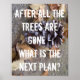 Nachdem alle Bäume verschwunden sind - was ist der nächste Plan? sagt dieses Waldschutzplakat über Klimawandel, globale Erwärmung, Erdertagsarbeit und grüne Geschäftspraktiken. Dieses Poster ist eine großartige Erinnerung, was auf dem Spiel steht, wenn wir vor dem Aussterben von Arten und ihren Lebensräumen in der Wildnis stehen, Bäume ohne Rücksicht auf die hunderte Jahre des Wachstums nutzen, die es brauchte, um sie zu haben, und wie wir nachhaltigere Geschäftspraktiken unterstützen. Wildlife poster Naturschutztiere - CricketDiane Designer / Artist 2017 und Cricket House Studios Art und Design (201 4 Remix)