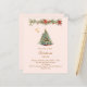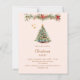 Eine Wintereinladung für ein Weihnachtsfest im Party. Die Vorderseite ist mit einem weichen, beigefarbenen Hintergrund und einem von Hand gezeichnet Kiefernbaum mit roten und goldenen Ziergegenständen geschmückt. Einige Sterne und eine weihnachtlich dekorierte Garage mit Zapfen und roten Poinsettia Blume. Personalisieren Sie Ihre Party-Daten und fügen Sie sie hinzu. Goldener Text. 1 Blatt = 1 Einladung mit Druckkante bis Kante.