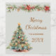 Weiche, grüne Kiefernhöhle mit einem von Hand gezeichnet, wasserfarbenen Kiefernwald mit roten und goldenen Ziergegenständen. Einige Sterne und eine weihnachtlich dekorierte Garage mit Zapfen und roten Poinsettia Blume. Text: Frohe Weihnachten. Personalisieren und fügen Sie Ihren Familiennamen und das Jahr hinzu.