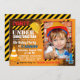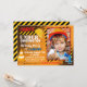 Baustelle mit schmutzigen Hintergrund, hartem Hut, Kegel und Bauband. Geburtstagsparty Einladungskarte Design. Alter 4.