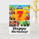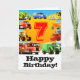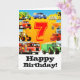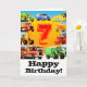 Neun farbenfrohe LKWs umgeben eine große Zahl 7! Gib dein eigenes Alter hinzu! Ein Betonmischer, blauer LKW, gelber Bulldozer, rote Straßenwalze, grüner Traktor, großer roter Feuerwehrwagen, gelber Bagger und ein Bastler! Alle Arten von Baufahrzeugen und Transport. Ideal für einen Jungen zum 7. Geburtstag.