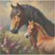 Ein herzzerwärmendes Gemälde mit einer Mare aus einer Bucht, das in einem lebendigen Feld von Wildblumen direkt neben ihrem Fohlen stehend ist. Die sanften Pinselstriche und die lebhaften Details zeichnen die zarte Verbindung zwischen den Pferden aus, das Set gegen eine ruhige und farbenfrohe Landschaft.
