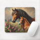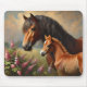 Ein herzzerwärmendes Gemälde mit einer Mare aus einer Bucht, das in einem lebendigen Feld von Wildblumen direkt neben ihrem Fohlen stehend ist. Die sanften Pinselstriche und die lebhaften Details zeichnen die zarte Verbindung zwischen den Pferden aus, das Set gegen eine ruhige und farbenfrohe Landschaft.