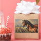 Ein herzzerwärmendes Gemälde mit einer Mare aus einer Bucht, das in einem lebendigen Feld von Wildblumen direkt neben ihrem Fohlen stehend ist. Die sanften Pinselstriche und die lebhaften Details zeichnen die zarte Verbindung zwischen den Pferden aus, das Set gegen eine ruhige und farbenfrohe Landschaft.