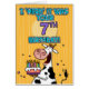 " Ich "lebe" es war Ihr 7. Geburtstag!" in Herden b-tägige Kuh des Spaßes, die eine Geburtstagskuchen-Grußkarte hält.