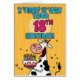 " Ich "lebe" es war Ihr 18. Geburtstag!" in Herden b-tägige Kuh des Spaßes, die eine Geburtstagskuchen-Grußkarte hält.