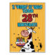 " Ich "lebe" es war Ihr 28. Geburtstag!" in Herden b-tägige Kuh des Spaßes, die eine Geburtstagskuchen-Grußkarte hält.