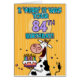 " Ich "lebe" es war Ihr 84. Geburtstag!" in Herden b-tägige Kuh des Spaßes, die eine Geburtstagskuchen-Grußkarte hält.
