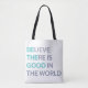 Carry a message of hope wherever you go. This clean, minimalist tote features the uplifting phrase “Believe There Is Good in the World” in soft, calming tones, a gentle reminder that kindness still exists and every small action matters.