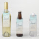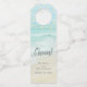 Eine wunderschöne aquablaue Strandlandschaft mit Meereswellen, die am Ufer abstürzen, Set die Stimmung für dieses Hochzeitswein-Flaschenschild an der Küste. Die Rückseite hat rustikales, verwittertes Holz.