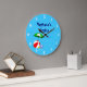 Eine individuelle Uhr mit lustiger Kunst von essenziellen Spielzeugen für den Strand oder den Pool, ein roter Beachball, grüner Schirm, Sandalen und Sonnenöl auf blauem Hintergrund mit lockigen Wellen und optionalen weißen Zahlen. Klicken Sie auf Anpassen, um Schriftart, Farben zu ändern, sogar Ihr Design für später retten.