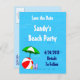Eine individuelle, Save the Date Postkarte mit lustigen Strand- oder Schwimmbeckenmotiven Kunst eines roten Beachballs, grünem Sonnenschirm, Sandalen und Sonnenanbeteröl auf einem wasserblauen Hintergrund mit Wellen. Füllen Sie Ihre Party-Informationen, und Rücksendeadresse in einem lustigen, Retro-Schriftart.