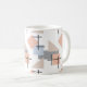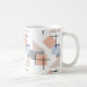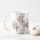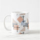 Diese Tasse hat ein Bauhaus-Design aus größeren, sich wiederholenden Rechtecken, Quadraten, Diamanten und Dreiecken in Strandfarben Bräune, Grau, Blau und Orange.