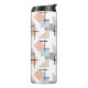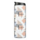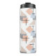 Diese Thermalflasche hat ein Bauhaus-Design aus sich wiederholenden Rechtecken, Quadraten, Diamanten und Dreiecken in Strandfarben von Bräune, Grau, Blau und Orange.