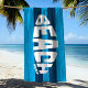 STRAND BITTE! Dieses coole, einzigartige Design zeichnet sich durch moderne Typografie aus, die der Form eines Surfbrettes auf einem gestreiften Hintergrund ähnelt. Verwenden Sie das Entwurfstool, um die Streifen-Farben zu ändern.