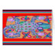 Orange, türkisfarbene, grafische Gestaltung auf einer Stranddecke. Südwestlich, afrikanische Grafik des lächelnden Krokus. Tucson, Arizona, Virginia Vivier Design.
