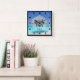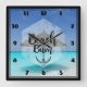 Eine quadratische Uhr mit einem tropischen Bild eines türkisfarbenen Meeres mit einem weißen Sandstrand und einem Single mit Strohschirm. Typografie sagt Beach Bum.