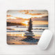 Stein Cairn am Strand mit Sonnenuntergang Himmel und Ozeanwellen.