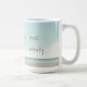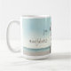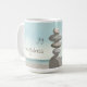 Beginnen Sie Ihren Morgen mit dieser 15-Unzen-Tasse, die eine Strandlandschaft mit Cairn-Steinen im Vordergrund mit den individuellen Worten "Freude, Frieden, Beachtlichkeit und Gelassenheit.