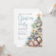 On the bottom right, a large Christmas tree made of beach shells, starfish, and coral adds a whimsical coastal touch, creating an overall teal blue and tan color palette that feels perfect for a laid-back holiday gathering.