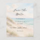 A watercolored sandy beach, sand dunes, ocean waves background. Personalize and add a date and your names. The text: Save the Date is written with a large trendy hand lettered style script.