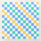 A colorful checkered pattern with alternating blue, green, and yellow squares on a white background. The design is vibrant and geometric, creating a playful tone.